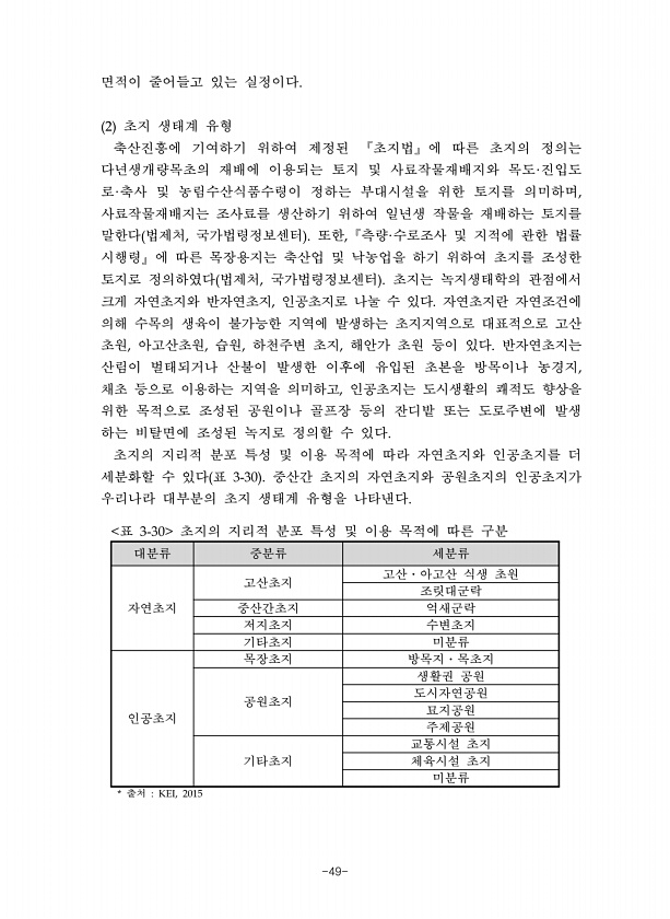 -49- 면적이 줄어들고 있는 실정이다 초지 생태계 유형 축산진흥에 기여하기 위하여 제정된 초지법 에 따른 초지의 정의는 다년생개량목초의 재배에 이용되는 토지 및 사료작물재배지와 목도 진입도 로 축사 및 농림수산식품수령이 정하는 부대시설을 위한 토지를 의미하며 사료작물재배지는 조사료를 생산하기 위하여 일년생 작물을 재배하는 토지를 말한다 법제처 국가법령정보센터 또한 측량 수로조사 및 지적에 관한 법률 시행령 에 따른 목장용지는 축산업 및 낙농업을 하기 위하여 초지를 조성한 토지로 정의하였다 법제처 국가법령정보센터 초지는 녹지생태학의 관점에서 크게 자연초지와 반자연초지 인공초지로 나눌 수 있다 자연초지란 자연조건에 의해 수목의 생육이 불가능한 지역에 발생하는 초지지역으로 대표적으로 고산 초원 아고산초원 습원 ...