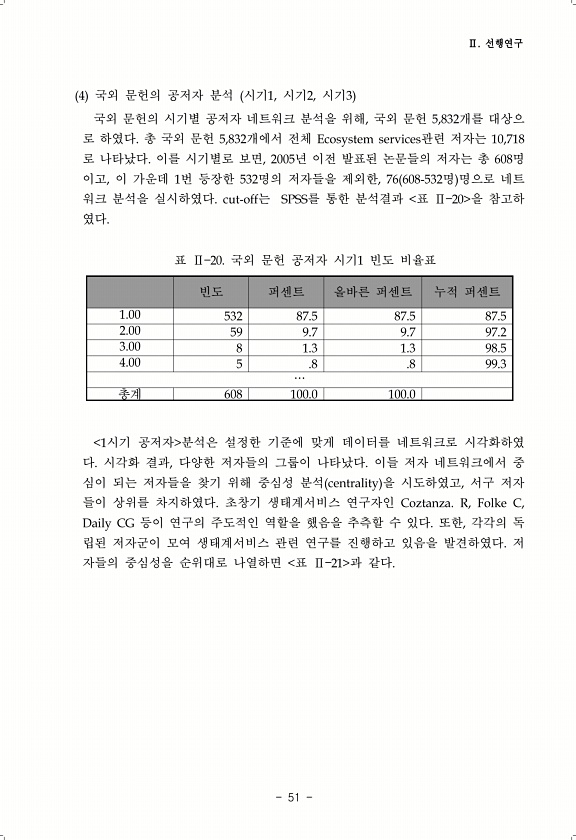 Ⅱ. 선행연구 51 4 국외 문헌의 공저자 분석 시기1, 시기2, 시기3 국외 문헌의 시기별 공저자 네트워크 분석을 위해, 국외 문헌 5,832개를 대상으 로 하였다. 총 국외 문헌 5,832개에서 전체 Ecosystem services관련 저자는 10,718 로 나타났다. 이를 시기별로 보면, 2005년 이전 발표된 논문들의 저자는 총 608명 이고, 이 가운데 1번 등장한 532명의 저자들을 제외한, 76 608-532명 명으로 네트 워크 분석을 실시하였다. cut-off는 SPSS를 통한 분석결과 표 Ⅱ 20 을 참고하 였다. 빈도 퍼센트 올바른 퍼센트 누적 퍼센트 1.00 532 87.5 87.5 87.5 2.00 59 9.7 9.7 97.2 3.00 8 1.3 1.3 98.5 4.00 5 .8 .8...
