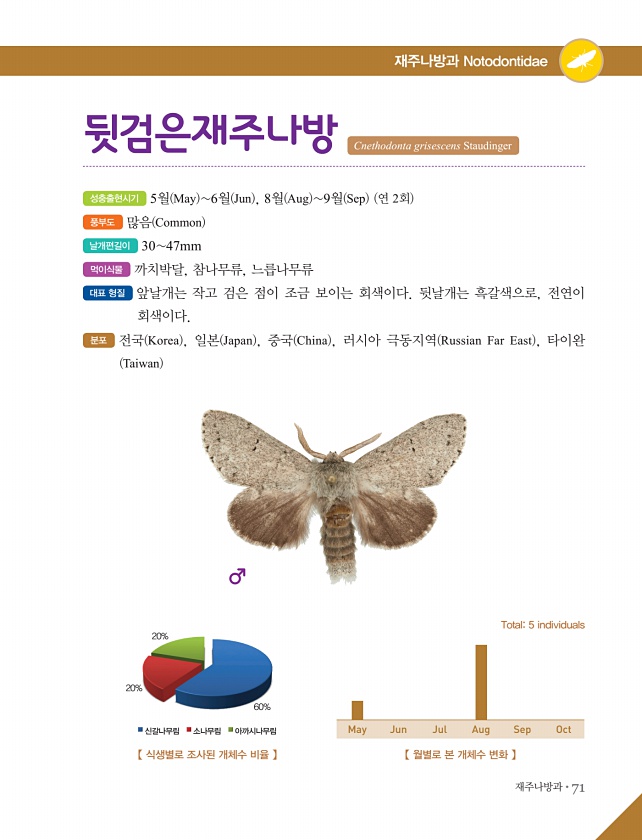 재주나방과?71 재주나방과 Notodontidae 성충출현시기 5월 May 6월 Jun , 8월 Aug 9월 Sep 연 2회 풍부도 많음 Common 날개편길이 3047mm 먹이식물 까치박달, 참나무류, 느릅나무류 대표 형질 앞날개는 작고 검은 점이 조금 보이는 회색이다. 뒷날개는 흑갈색으로, 전연이 회색이다. 분포 전국 Korea , 일본 Japan , 중국 China , 러시아 극동지역 Russian Far East , 타이완 Taiwan 뒷검은재주나방 Cnethodonta grisescens Staudinger 【 월별로 본 개체수 변화 】 Total5 individuals 【 식생별로 조사된 개체수 비율 】 20% 신갈나무림 소나무림 아까시나무림 20% 60% May Jun Jul Aug SepOct