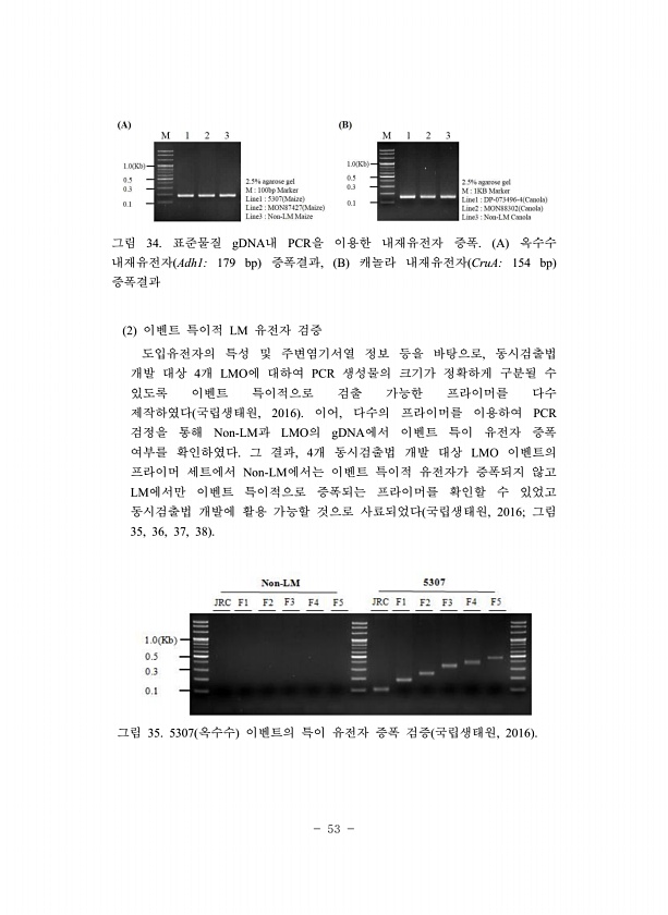 53 그림 34. 표준물질 gDNA내 PCR을 이용한 내재유전자 증폭. A 옥수수 내재유전자 Adh1179 bp 증폭결과, B 캐놀라 내재유전자 CruA154 bp 증폭결과 2 이벤트 특이적 LM 유전자 검증 도입유전자의 특성 및 주변염기서열 정보 등을 바탕으로, 동시검출법 개발 대상 4개 LMO에 대하여 PCR 생성물의 크기가 정확하게 구분될 수 있도록 이벤트 특이적으로 검출 가능한 프라이머를 다수 제작하였다 국립생태원, 2016 이어, 다수의 프라이머를 이용하여 PCR 검정을 통해 Non-LM과 LMO의 gDNA에서 이벤트 특이 유전자 증폭 여부를 확인하였다. 그 결과, 4개 동시검출법 개발 대상 LMO 이벤트의 프라이머 세트에서 Non-LM에서는 이벤트 특이적 유전자가 증폭되지 않고 LM에서만 이벤트 ...