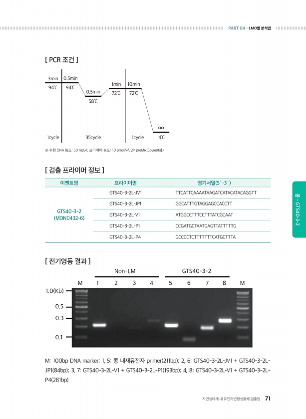 자연생태계 내 유전자변형생물체 검출법 71 PART 04?LMO별 분석법 콩?GTS40-3-2 [ 검출 프라이머 정보 ] 이벤트명 프라이머명 염기서열 5`-3` GTS40-3-2 MON0432-6 GTS40-3-2L-JV1 TTCATTCAAAATAAGATCATACATACAGGTT GTS40-3-2L-JP1 GGCATTTGTAGGAGCCACCTT GTS40-3-2L-V1 ATGGCCTTTCCTTTATCGCAAT GTS40-3-2L-P1 CCGATGCTAATGAGTTATTTTTG GTS40-3-2L-P4 GCCCCTCTTTTTTTCATGCTTTA M100bp DNA marker; 1, 5콩 내재유전자 primer 211bp ; 2, 6GTS40-3-2L-JV1 + GTS40-3-2LJP1 84bp ; 3, 7G...