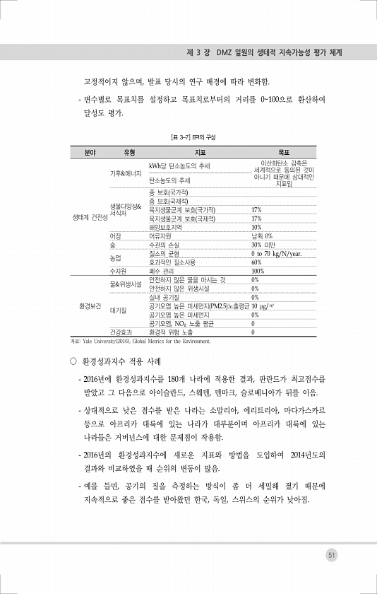 51 제 3 장 DMZ 일원의 생태적 지속가능성 평가 체계 고정적이지 않으며, 발표 당시의 연구 배경에 따라 변화함. 변수별로 목표치를 설정하고 목표치로부터의 거리를 0100으로 환산하여 달성도 평가. 분야 유형 지표 목표 생태계 건전성 기후&에너지 kWh당 탄소농도의 추세 이산화탄소 감축은 세계적으로 동의된 것이 아니기 때문에 상대적인 탄소농도의 추세 지표임 생물다양성& 서식처 종 보호 국가적 종 보호 국제적 육지생물군계 보호 국가적 17% 육지생물군계 보호 국제적 17% 해양보호지역 10% 어장 어류자원 남획 0% 숲 수관의 손실 30% 미만 농업 질소의 균형 0 to 70 kg/N/year. 효과적인 질소사용 60% 수자원 폐수 관리 100% 환경보건 물&위생시설 안전하지 않은 물을 마시는 것 0% 안...