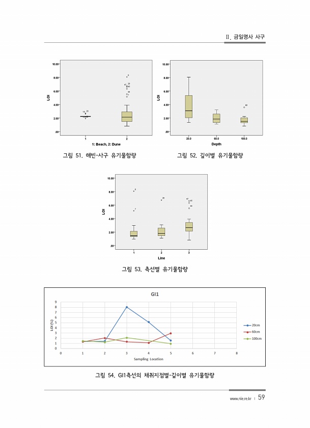 Ⅱ. 금일명사 사구 www.nie.re.kr ? 59 그림 51. 해빈-사구 유기물함량 그림 52. 깊이별 유기물함량 그림 53. 측선별 유기물함량 그림 54. GI1측선의 채취지점별-깊이별유기물함량
