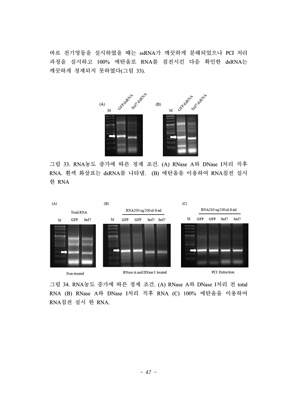 47 바로 전기영동을 실시하였을 때는 ssRNA가 깨끗하게 분해되었으나 PCI 처리 과정을 실시하고 100% 에탄올로 RNA를 침전시킨 다음 확인한 dsRNA는 깨끗하게 정제되지 못하였다 그림 33 그림 33. RNA농도 증가에 따른 정제 조건. A RNase A와 DNase I처리 직후 RNA. 흰색 화살표는 dsRNA를 나타냄. B 에탄올을 이용하여 RNA침전 실시 한 RNA 그림 34. RNA농도 증가에 따른 정제 조건. A RNase A와 DNase I처리 전 total RNA B RNase A와 DNase I처리 직후 RNA C 100% 에탄올을 이용하여 RNA침전 실시 한RNA.