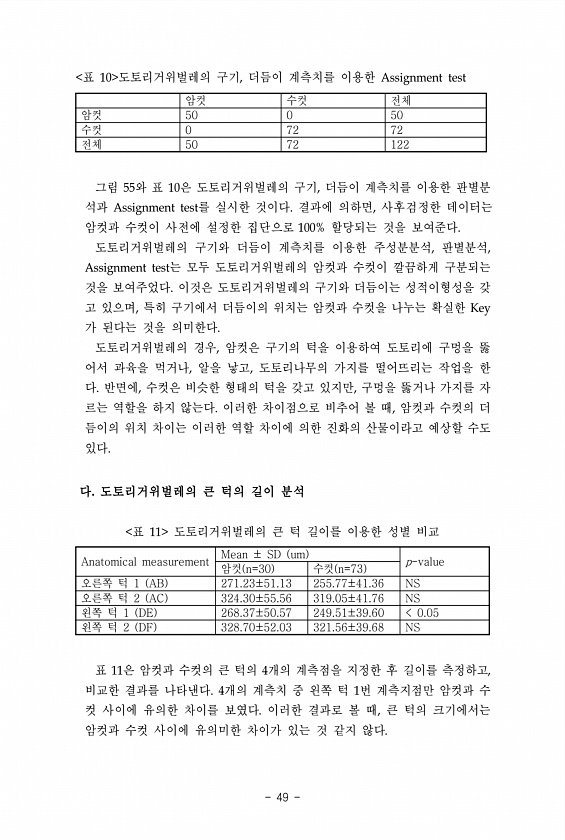 49 암컷 수컷 전체 암컷 50 0 50 수컷 0 72 72 전체 50 72 122 표 10 도토리거위벌레의 구기, 더듬이 계측치를 이용한 Assignment test 그림 55와 표 10은 도토리거위벌레의 구기, 더듬이 계측치를 이용한 판별분 석과 Assignment test를 실시한 것이다. 결과에 의하면, 사후검정한 데이터는 암컷과 수컷이 사전에 설정한 집단으로 100% 할당되는 것을 보여준다. 도토리거위벌레의 구기와 더듬이 계측치를 이용한 주성분분석, 판별분석, Assignment test는 모두 도토리거위벌레의 암컷과 수컷이 깔끔하게 구분되는 것을 보여주었다. 이것은 도토리거위벌레의 구기와 더듬이는 성적이형성을 갖 고 있으며, 특히 구기에서 더듬이의 위치는 암컷과 수컷을 나누는 확실한 Key 가 된...