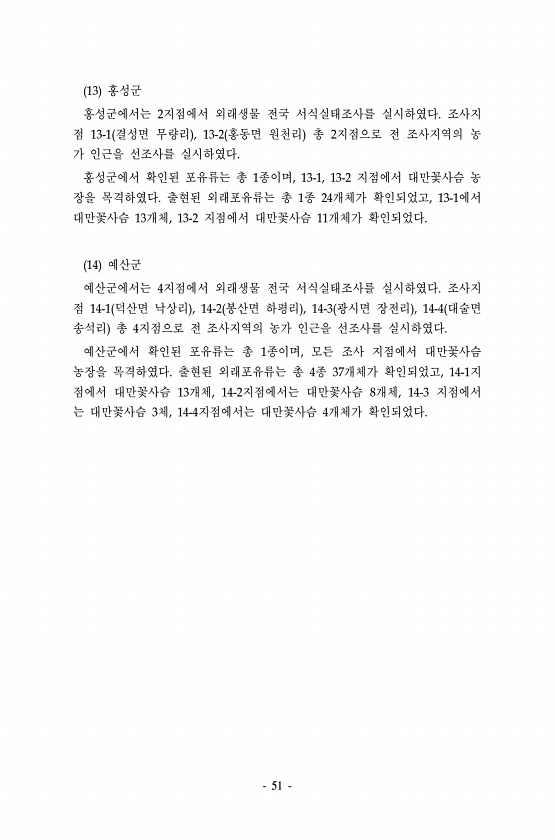 51 13 홍성군 홍성군에서는 2지점에서 외래생물 전국 서식실태조사를 실시하였다. 조사지 점 13-1 결성면 무량리 , 13-2 홍동면 원천리 총 2지점으로 전 조사지역의 농 가 인근을 선조사를 실시하였다. 홍성군에서 확인된 포유류는 총 1종이며, 13-1, 13-2 지점에서 대만꽃사슴 농 장을 목격하였다. 출현된 외래포유류는 총 1종 24개체가 확인되었고, 13-1에서 대만꽃사슴 13개체, 13-2 지점에서 대만꽃사슴 11개체가 확인되었다. 14 예산군 예산군에서는 4지점에서 외래생물 전국 서식실태조사를 실시하였다. 조사지 점 14-1 덕산면 낙상리 , 14-2 봉산면 하평리 , 14-3 광시면 장전리 , 14-4 대술면 송석리 총 4지점으로 전 조사지역의 농가 인근을 선조사를 실시하였다. 예산군에서 확인...
