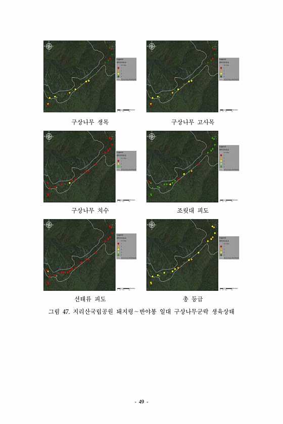 49 구상나무 생목 구상나무 고사목 구상나무 치수 조릿대 피도 선태류 피도 총 등급 그림 47. 지리산국립공원 돼지령∼반야봉 일대 구상나무군락생육상태