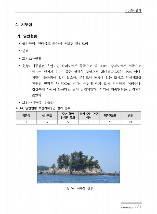 Ⅱ. 조사결과 www.nie.re.kr ? 61 4. 시투섬 가. 일반현황 ? 행정구역전라북도 군산시 옥도면 관리도리 ? 면적? 토지소유현황? 현황시투섬은 유인도인 관리도에서 동쪽으로 약 200m, 장자도에서 서쪽으로 약1km 떨어져 있다. 둥근 삼각형 모양으로 최대해발고도는 15m 이다. 지번이 등록되어 있지 않으며, 무인도서 목록에 없는 도서로 위성지도상 확인된 면적은 약 5000㎡ 이다. 주변에 여가 많아 정박하기 어려우나, 정상부에 사람이 돌아다닌 길이 발견되었다. 이외에 훼손현황은 발견되지 않았다. ? 보전가치등급Ⅰ등급 표 14. 일반현황 보전가치등급 평가 점수 접근성 훼손정도 주변 해양 양식장 규모 과거 주민 거주 여부 인공구조물 총점 1 5 5 5 5 21 그림 52. 시투섬전경