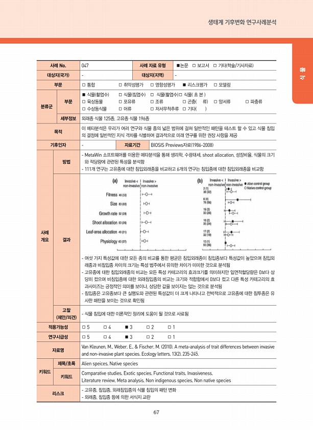 67 생태계 기후변화 연구사례분석 식 물 사례 No. 047 사례 자료 유형 ■논문 □ 보고서 □ 기타 학술/기사자료 대상지 국가 대상지 지역 부문 □ 통합 □ 취약성평가 □ 영향성평가 ■ 리스크평가 □ 모델링 분류군 부문 ■ 식물 활엽수 □ 식물 침엽수 □ 식물 활엽수 □ 식물 초 본 □ 육상동물 □ 포유류 □ 조류 □ 곤충 류 □ 양서류 □ 파충류 □ 수상동식물 □ 어류 □ 저서무척추류 □ 기타 세부정보 외래종 식물 125종, 고유종 식물 196종 목적 이 메타분석은 우리가 여러 연구와 식물 종의 넓은 범위에 걸쳐 일반적인 패턴을 테스트 할 수 있고 식물 침입 의 결정에 일반적인 지식 격차를 식별하여 결과적으로 미래 연구를 위한 권장 사항을 제공 기후인자 자료기간 BIOSIS Previews자료 1986...