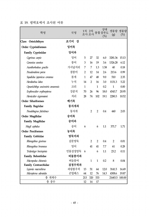 45 학명 국명 1차 조사 2차 조사 총합 상대 풍부도 % 생물량 g 생물량 % Class Osteichthyes 조기어 강 Order Cypriniformes 잉어목 Family Cyprinidae 잉어과 Cyprinus carpio 잉어 5 27 32 6.0 3281.36 15.13 Carassius auratus 붕어 3 16 19 3.6 1326.28 6.12 Acanthorhodeus gracilis 가시납지리 7 7 1.3 1.58 40 0.18 Pseudorasbora parva 참붕어 2 12 14 2.6 213.6 0.99 Squalidus japonicus coreanus 몰개 1 47 48 9.0 510 2.35 Hemibarbus labeo 누치 14 2 16 3.0 1131.3 5.2...