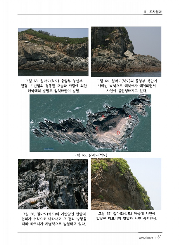 Ⅱ. 조사결과 www.nie.re.kr ? 61 그림 63. 질마도 석도 중앙부 능선부 전경. 기반암의 경동된 모습과 파랑에 의한 해식해의 발달로 암석해안이 발달. 그림 64. 질마도 석도 의 중앙부 북단에 나타난 낙석으로 해식애가 해체되면서 사면이 불안정해지고 있다. 그림 65. 질마도 석도 그림 66. 질마도 석도 의 기반암인 편암의 편리가 수직으로 나타나고 그 편리 방향을 따라 타포니가 차별적으로 발달하고 있다. 그림 67. 질마도 석도 해식애 사면에 발달한 타포니의 발달과 사면붕괴현상.