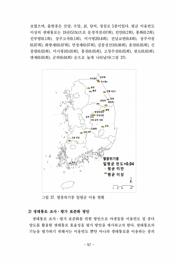 57 보였으며, 출현종은 산양, 수달, 삵, 담비, 청설모 5종이었다. 평균 이용빈도 이상의 생태통로는 19곳 51% 으로 문경작천리 !회 , 진안 0.2회 , 봉화 0.2회 , 진부령 0.1회 , 상주고곡 0.1회 , 미시령2 0.8회 , 진남교반 0.8회 , 상주서원 0.07회 , 화방재 0.07회 , 연정재 0.07회 , 강릉성산1 0.06회 , 춘천 0.05회 , 신 풍령 0.05회 , 미시령1 0.05회 , 홍천 0.05회 , 고창주진 0.05회 , 완도 0.05회 , 댓재 0.05회 , 군위 0.04회 순으로 높게 나타났다 그림 37 그림 37. 멸종위기종 일평균 이용 현황 2 생태통로 조사·평가 표준화 방안 생태통로 조사·평가 표준화를 위한 방안으로 야생동물 이용빈도 및 종다 양도를 활용한 생태...