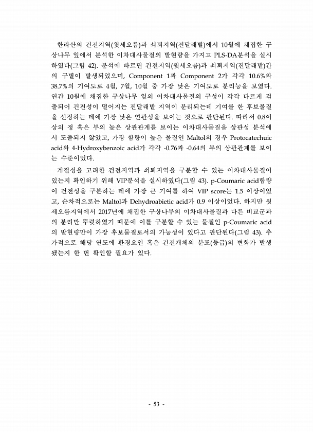 53 한라산의 건전지역 윗세오름 과 쇠퇴지역 진달래밭 에서 10월에 채집한 구 상나무 잎에서 분석한 이차대사물질의 발현량을 가지고 PLS-DA분석을 실시 하였다 그림 42 분석에 따르면 건전지역 윗세오름 과 쇠퇴지역 진달래밭 간 의 구별이 발생되었으며, Component 1과 Component 2가 각각 10.6%와 38.7%의 기여도로 4월, 7월, 10월 중 가장 낮은 기여도로 분리능을 보였다. 연간 10월에 채집한 구상나무 잎의 이차대사물질의 구성이 각각 다르게 검 출되어 건전성이 떨어지는 진달래밭 지역이 분리되는데 기여를 한 후보물질 을 선정하는 데에 가장 낮은 연관성을 보이는 것으로 판단된다. 따라서 0.8이 상의 정 혹은 부의 높은 상관관계를 보이는 이차대사물질을 상관성 분석에 서 도출되지 않았고...