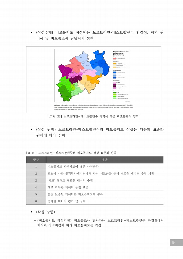 30 § 작성주체 비오톱지도 작성에는 노르트라인-베스트팔렌주 환경청, 지역 관 리자 및 비오톱조사 담당자가 참여 [그림 33] 노르트라인-베스트팔렌주 지역에 따른 비오톱관리 영역 § 작성 원칙 노르트라인-베스트팔렌주의 비오톱지도 작성은 다음의 표준화 원칙에 따라 수행 구분 내용 1 비오톱지도 과거자료에 대한 사전파악 2 필요에 따라 원격탐사데이터에서 사전 지도화를 통해 새로운 데이터 수집 계획 3 ‘지도’ 형태로 새로운 데이터 수집 4 새로 획득한 데이터 품질 보증 5 품질 보증된 데이터를 비오톱지도에 수록 6 연차별 데이터 평가 및 공개 [표 20] 노르트라인-베스트팔렌주의 비오톱지도 작성 표준화 원칙 § 작성 방법 비오톱지도 작성지침 비오톱조사 담당자는 노르트라인-베스트팔렌주 환경청에서 제시한 작성지침에...