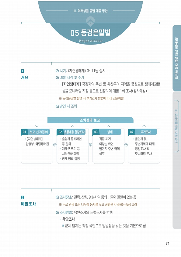 71 외래생물 관리 종합 대응 매뉴얼 Ⅲ. 외래생물 종별 대응 방안 Ⅲ. 외래생물 종별 대응 방안 ? ? 시기자연생태계 311월 실시 예찰 지역 및 주기 [자연생태계] 국경지역 주변 등 확산우려 지역을 중심으로 생태계교란 생물 모니터링 지점 등으로 선정하여 매월 1회 조사 상시예찰 ※ 등검은말벌 발견 시 추가조사 방법에 따라 집중예찰 발견 시 조치 조사장소관목, 산림, 양봉지역 등의 나무와 꿀벌이 있는 곳 ※ 주로 관목 또는 나무에 둥지를 짓고 꿀벌을 사냥하는 습성 고려 조사방법육안조사와 트랩조사를 병행 육안조사 군체 탐지는 직접 육안으로 말벌집을 찾는 것을 기본으로 함 05 등검은말벌 01 02 03 04 보고, 신고 접수 초동대응 현장조사 방제 추가조사 조치결과 보고 ?[자연생태계] 환경부, 국립생태원 ...