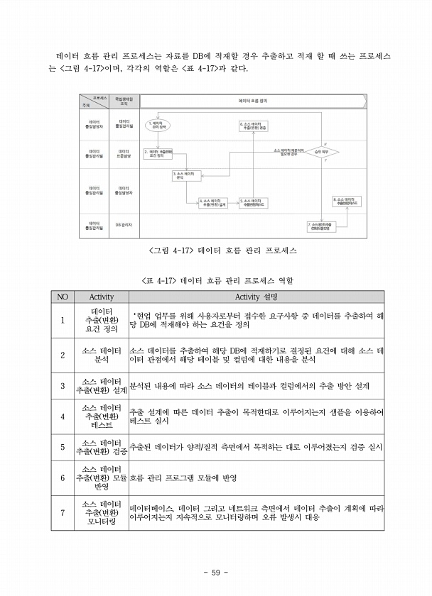 59 데이터 흐름 관리 프로세스는 자료를 DB에 적재할 경우 추출하고 적재 할 때 쓰는 프로세스 는 그림 4-17 이며, 각각의 역할은 표 4-17 과 같다. 그림 4-17 데이터 흐름 관리 프로세스 NO Activity Activity 설명 1 데이터 추출 변환 요건 정의 ‘현업 업무를 위해 사용자로부터 접수한 요구사항 중 데이터를 추출하여 해 당 DB에 적재해야 하는 요건을 정의 2 소스 데이터 분석 소스 데이터를 추출하여 해당 DB에 적재하기로 결정된 요건에 대해 소스 데 이터 관점에서 해당 테이블 및 컬럼에 대한 내용을 분석 3 소스 데이터 추출 변환 설계 분석된 내용에 따라 소스 데이터의 테이블과 컬럼에서의 추출 방안 설계 4 소스 데이터 추출 변환 테스트 추출 설계에 따른 데이터 추출이 목적한대로...