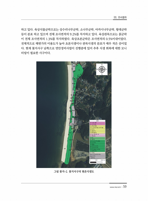 III. 조사결과 www.nie.re.kr ? 59 하고 있다. 육상식물군락으로는 상수리나무군락, 소나무군락, 아까시나무군락, 왕대군락 등이 분포 하고 있으며 전체 조사면적의 9.2%를 차지하고 있다. 육상관목으로는 칡군락 이 전체 조사면적의 1.3%를 차지하였다. 육상초본군락은 조사면적의 0.5%이내이었다. 전체적으로 해변가의 이용도가 높아 초본식생이나 관목식생의 분포가 매우 적은 곳이었 다. 현재 꽃지사구 남쪽으로 연안정비사업이 진행중에 있어 추후 식생 회복에 대한 모니 터링이 필요한 사구이다. 그림 꽃지-2. 꽃지사구의현존식생도
