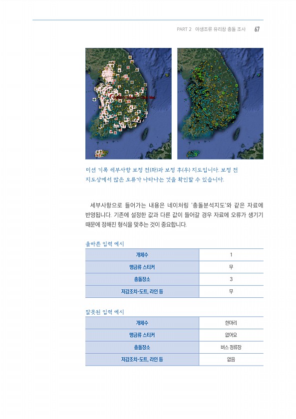 세부사항으로 들어가는 내용은 네이처링 ‘충돌분석지도’와 같은 자료에 반영됩니다. 기존에 설정한 값과 다른 값이 들어갈 경우 자료에 오류가 생기기 때문에 정해진 형식을 맞추는 것이 중요합니다. 올바른 입력 예시 개체수 1 맹금류 스티커 무 충돌장소 3 저감조치-도트, 라인 등 무 잘못된 입력 예시 개체수 한마리 맹금류 스티커 없어요 충돌장소 버스 정류장 저감조치-도트, 라인 등 없음 미션 기록 세부사항 보정 전 좌 과 보정 후 우 지도입니다. 보정 전 지도상에서 많은 오류가 나타나는 것을 확인할 수 있습니다. PART 2 야생조류 유리창 충돌 조사67