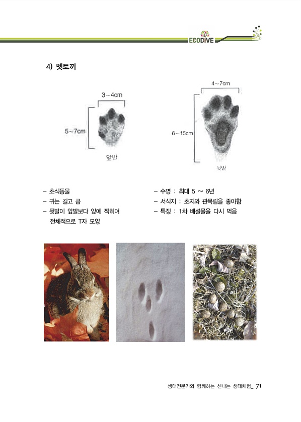 생태전문가와 함께하는 신나는 생태체험_ 71 4 멧토끼 초식동물 귀는 길고 큼 뒷발이 앞발보다 앞에 찍히며 전체적으로 T자 모양 수명 최대 5 6년 서식지 초지와 관목림을 좋아함 특징 1차 배설물을 다시먹음