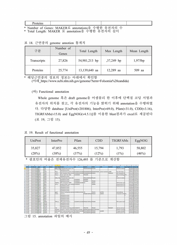 49 * Number of GenesMAKER annotations * Total LengthMAKER annotation 18. genome annotion * _https//www.ncbi.nlm.nih.gov/genome/?term=Folsomia%20candida Functional annotation Whole genome draft genome , annotation database [UniProt v201806 , InterPro v69.0 , Pfam v31.0 , CDD v3.16 , TIGRFAMs v15.0 and EggNOG v4.5.1 ] blast excel 19, 15 19. Result of functional annotation * 126,495 15. annotation Pr...