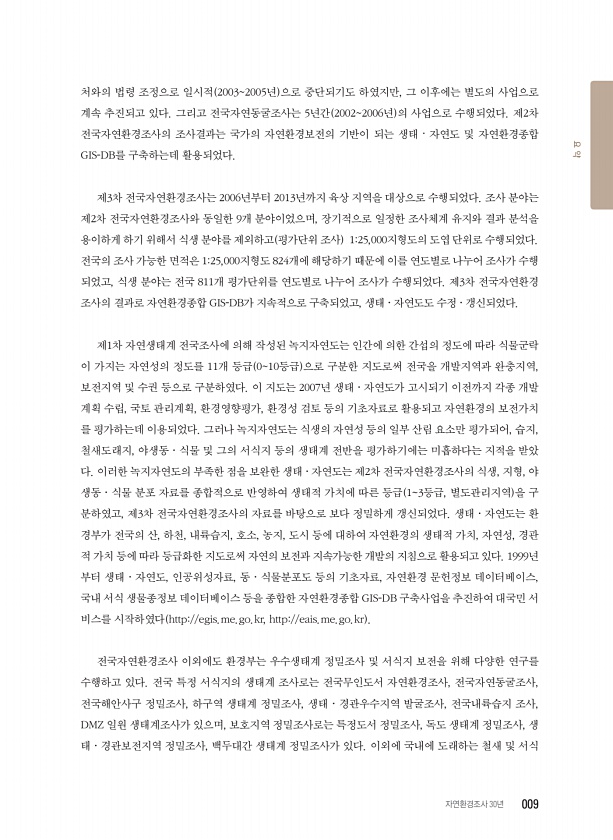 처와의 법령 조정으로 일시적 20032005년 으로 중단되기도 하였지만, 그 이후에는 별도의 사업으로 계속 추진되고 있다. 그리고 전국자연동굴조사는 5년간 20022006년 의 사업으로 수행되었다. 제2차 전국자연환경조사의 조사결과는 국가의 자연환경보전의 기반이 되는 생태·자연도 및 자연환경종합 GIS-DB를 구축하는데 활용되었다. 제3차 전국자연환경조사는 2006년부터 2013년까지 육상 지역을 대상으로 수행되었다. 조사 분야는 제2차 전국자연환경조사와 동일한 9개 분야이었으며, 장기적으로 일정한 조사체계 유지와 결과 분석을 용이하게 하기 위해서 식생 분야를 제외하고 평가단위 조사 125,000지형도의 도엽 단위로 수행되었다. 전국의 조사 가능한 면적은 125,000지형도 824개에 해당하기 때문에 이를 ...