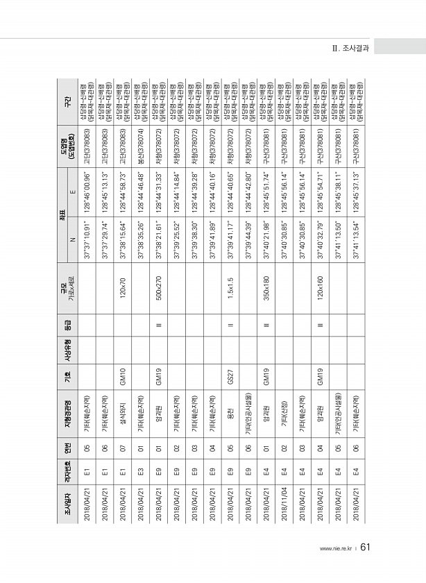 www ·nie·re·kr ? 61 조사일자 격자번호 연번 지형경관명 기호 사상유형 등급 규모 가로x세로 좌표 도엽명 N E 도엽번호 구간 2018/04/21 E1 05 기타 훼손지역 37°37′10.91″ 128°46′00.96″ 고단 378083 삽당령신배령 닭목재대관령 2018/04/21 E1 06 기타 훼손지역 37°37′29.74″ 128°45′13.13″ 고단 378083 삽당령신배령 닭목재대관령 2018/04/21 E1 07 설식와지 GM10 120x70 37°38′15.64″ 128°44′58.73″ 고단 378083 삽당령신배령 닭목재대관령 2018/04/21 E3 01 기타 훼손지역 37°38′35.26″ 128°44′46.48″ 봉산 378074 삽당령신배령 닭목재대관령 2018/04/2...