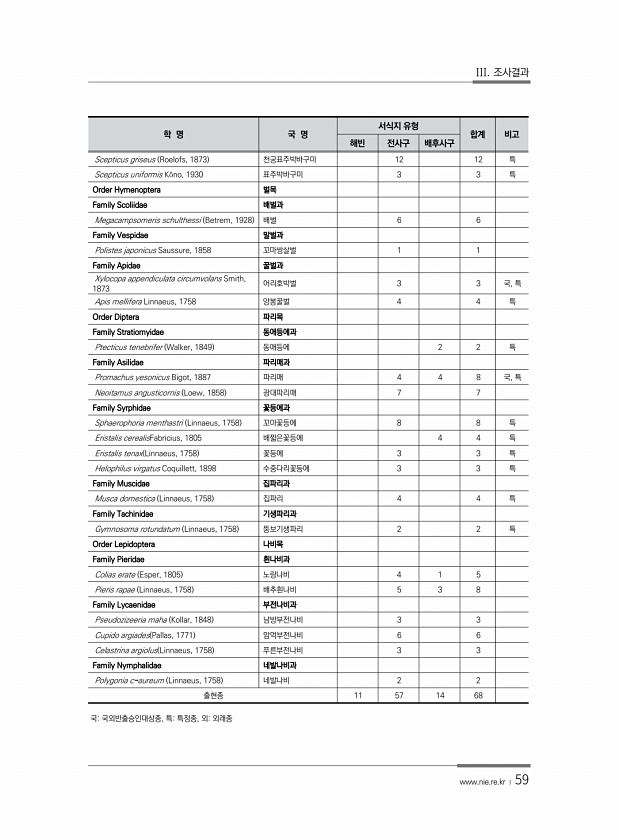 III. 조사결과 www.nie.re.kr ? 59 국국외반출승인대상종, 특특정종, 외외래종 학 명 국 명 서식지 유형 합계 비고 해빈 전사구 배후사구 Scepticus griseus Roelofs, 1873 천궁표주박바구미 12 12 특 Scepticus uniformis K?no, 1930 표주박바구미 3 3 특 Order Hymenoptera 벌목 Family Scoliidae 배벌과 Megacampsomeris schulthessi Betrem, 1928 배벌 6 6 Family Vespidae 말벌과 Polistes japonicus Saussure, 1858 꼬마쌍살벌 1 1 Family Apidae 꿀벌과 Xylocopa appendiculata circumvolans Smith, 1873 어리...
