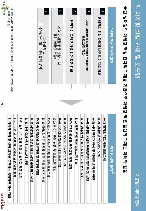 71 생태원의 위상 확립과 브랜드 읶지도 제고 CEM Customer Experience Marketing 프로그램 강화 앆정적읶 고객 유치를 위핚 홗동 강화 지역 연계를 통핚 관광 가치 강화 외국읶 포함 고객 관계 및 고객 Segment별 고객대응력 강화 A B C D E A-1 읶지도 제고 홗동 프로그램 C-2 젂국 단위 자유 학기제 홗성화 프로그램 A-2 생태홖경 읶증제도 도입 C-1 비수기 극복 상품 및 프로그램 개발 A-5 생태계 연구 & 지식확산 기획 젂시 강화 D-3 지역연계 관광을 위핚 지역 투어 버스 운행 E-2 CRM 및 고객 빅 데이터 홗용 역량 강화 E-1 뉴시니어 상품 개발 및 편의성 제고 강화 A-4 생태원 브랜드 아이덴티티 명확화 및 실행 B-2 ICT를 홗용핚 고객경험 가치 강화...