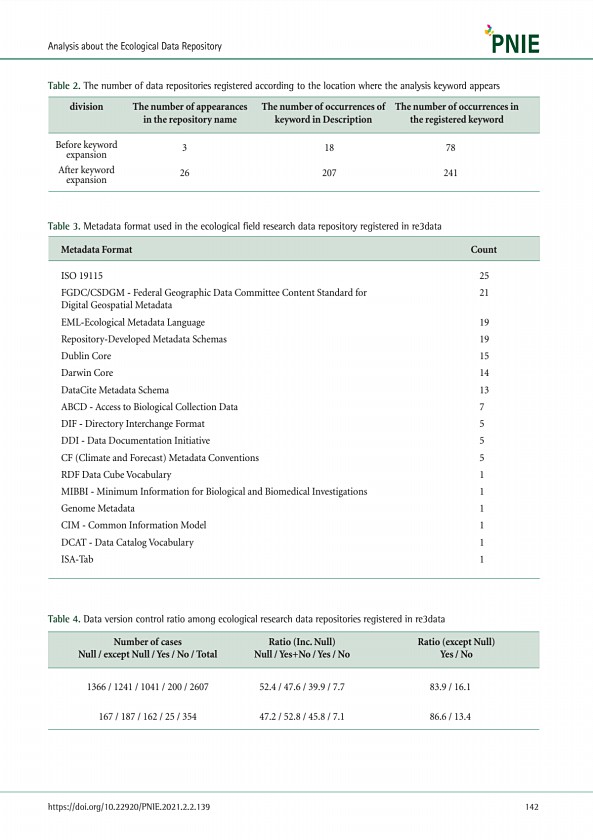 Table 2. The number of data repositories registered according to the location where the analysis keyword appears The number of appearances in the repository name division The number of occurrences of keyword in Description The number of occurrences in the registered keyword Before keyword expansion After keyword expansion 3 26 18 207 78 241 Table 3. Metadata format used in the ecological field res...