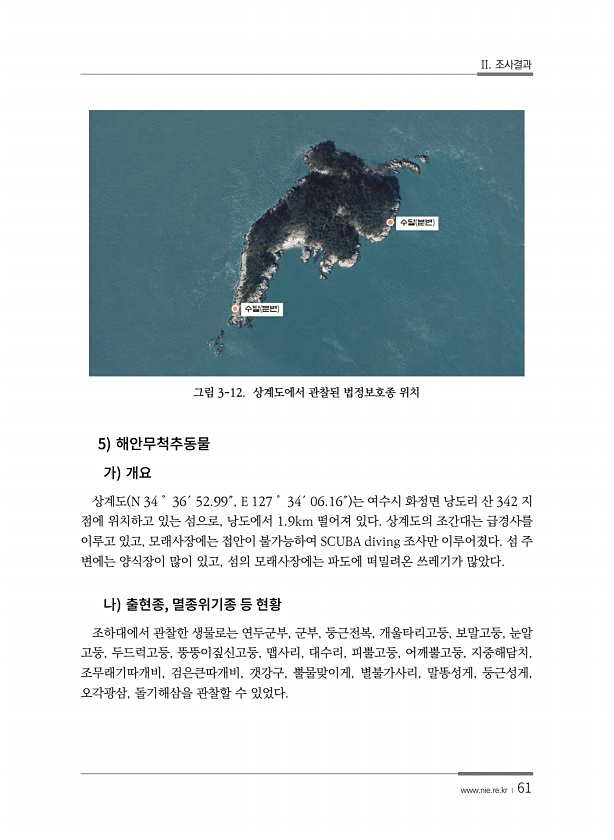 II. 조사결과 www.nie.re.kr ? 61 그림 3-12. 상계도에서 관찰된 법정보호종 위치 5 상계도 N 34˚ 36′ 52.99″, E 127˚ 34′ 06.16″ 는 여수시 화정면 낭도리 산 342 지 점에 위치하고 있는 섬으로, 낭도에서 1.9km 떨어져 있다. 상계도의 조간대는 급경사를 이루고 있고, 모래사장에는 접안이 불가능하여 SCUBA diving 조사만 이루어졌다. 섬 주 변에는 양식장이 많이 있고, 섬의 모래사장에는 파도에 떠밀려온 쓰레기가 많았다. , 조하대에서 관찰한 생물로는 연두군부, 군부, 둥근전복, 개울타리고둥, 보말고둥, 눈알 고둥, 두드럭고둥, 뚱뚱이짚신고둥, 맵사리, 대수리, 피뿔고둥, 어깨뿔고둥, 지중해담치, 조무래기따개비, 검은큰따개비, 갯강구, 뿔물맞이게, 별불가...