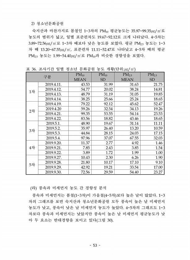 53 2 청소년문화공원 숙지산과 마찬가지로 봄철인 13차의 PM16 평균농도는 35.9799.35㎍/㎥로 농도의 범위가 넓고, 일별 표준편차도 19.6792.12로 크게 나타났다. 45차는 3.8972.56㎍/㎥로 13차 때보다 낮은 농도를 보였다. 평균 PM2.5 농도는 13 차 때 13.2667.55㎍/㎥, 표준편차 11.1152.47로 나타났고 45차 때의 평균 PM2.5 농도는 1.9954.46㎍/㎥로 PM16과 비슷한 경향성을 보였다. 구분 PM16 MEAN PM16 SD PM2.5 MEAN PM2.5 SD 1차 2619.4.11. 43.53 31.99 31.63 21.75 2619.4.12. 54.77 26.62 38.24 14.81 2619.4.13. 48.79 31.19 31.65 19.85 ...