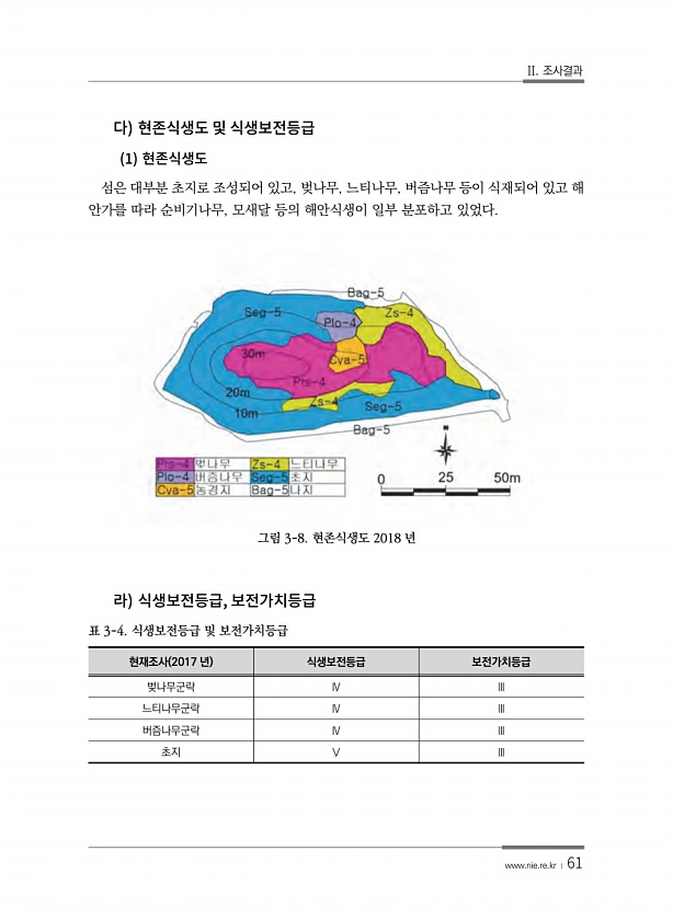 II. 조사결과 www.nie.re.kr ? 61 1 섬은 대부분 초지로 조성되어 있고, 벚나무, 느티나무, 버즘나무 등이 식재되어 있고 해 안가를 따라 순비기나무, 모새달 등의 해안식생이 일부 분포하고 있었다. 그림 3-8. 현존식생도 2018 년 , 현재조사 2017 년 식생보전등급 보전가치등급 벚나무군락 Ⅳ Ⅲ 느티나무군락 Ⅳ Ⅲ 버즘나무군락 Ⅳ Ⅲ 초지 Ⅴ Ⅲ 표 3-4. 식생보전등급 및보전가치등급