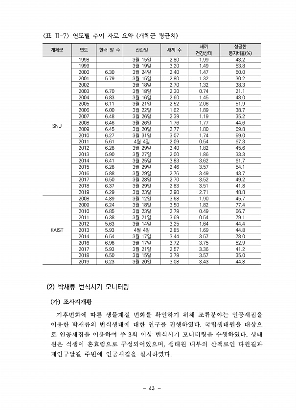 43 개체군 연도 한배 알 수 산란일 새끼 수 새끼 건강상태 성공한 둥지비율 % SNU 1998 3월 15일 2.80 1.99 43.2 1999 3월 19일 3.20 1.49 53.8 2000 6.30 3월 24일 2.40 1.47 50.0 2001 5.79 3월 15일 2.80 1.32 30.2 2002 3월 18일 2.70 1.32 38.3 2003 6.70 3월 18일 2.30 0.74 21.1 2004 6.83 3월 16일 2.60 1.45 48.0 2005 6.11 3월 21일 2.52 2.06 51.9 2006 6.00 3월 22일 1.62 1.89 38.7 2007 6.48 3월 26일 2.39 1.19 35.2 2008 6.46 3월 26일 1.76 1.77 44.6 2009 6.45 3월 2...