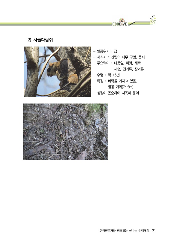생태전문가와 함께하는 신나는 생태체험_ 71 2 하늘다람쥐 멸종위기 Ⅱ급 서식지 산림의 나무 구멍, 둥지 주요먹이 나뭇잎, 씨앗, 새싹, 새순, 견과류, 장과류 수명 약 15년 특징 비막을 가지고 있음. 활공 거리 78m 성질이 온순하여 사육이용이