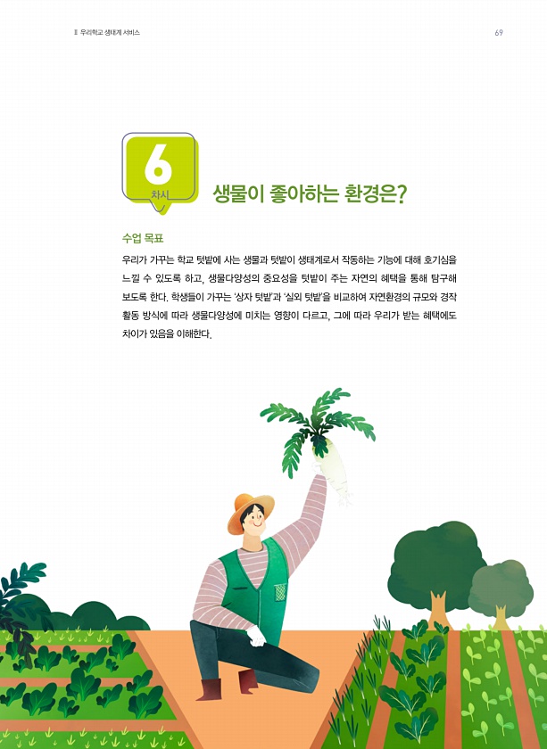 차시 6 수업 목표 우리가 가꾸는 학교 텃밭에 사는 생물과 텃밭이 생태계로서 작동하는 기능에 대해 호기심을 느낄 수 있도록 하고, 생물다양성의 중요성을 텃밭이 주는 자연의 혜택을 통해 탐구해 보도록 한다. 학생들이 가꾸는 ‘상자 텃밭’과 ‘실외 텃밭’을 비교하여 자연환경의 규모와 경작 활동 방식에 따라 생물다양성에 미치는 영향이 다르고, 그에 따라 우리가 받는 혜택에도 차이가 있음을 이해한다. 생물이 좋아하는 환경은? Ⅱ 우리학교 생태계 서비스69