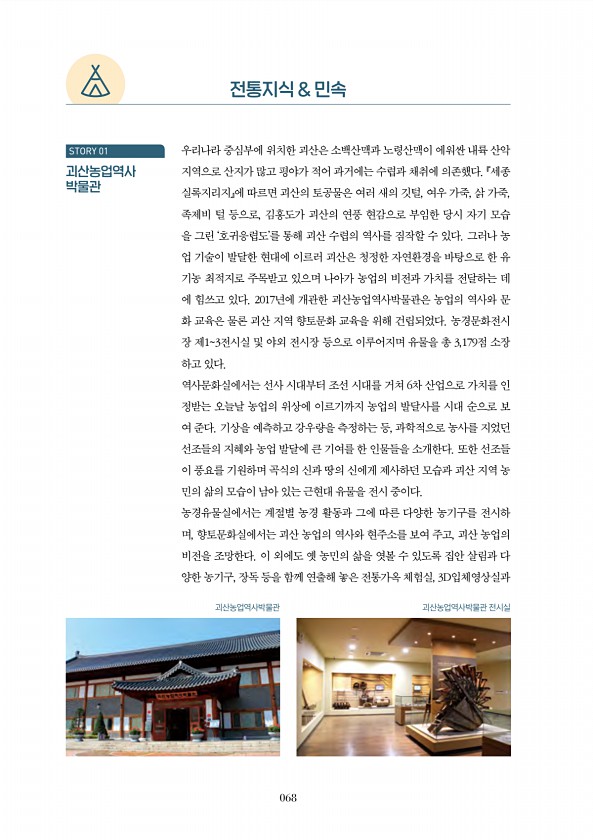 068 전통지식 & 민속 우리나라 중심부에 위치한 괴산은 소백산맥과 노령산맥이 에워싼 내륙 산악 지역으로 산지가 많고 평야가 적어 과거에는 수렵과 채취에 의존했다. 『세종 실록지리지』에 따르면 괴산의 토공물은 여러 새의 깃털, 여우 가죽, 삵 가죽, 족제비 털 등으로, 김홍도가 괴산의 연풍 현감으로 부임한 당시 자기 모습 을 그린 ‘호귀응렵도’를 통해 괴산 수렵의 역사를 짐작할 수 있다. 그러나 농 업 기술이 발달한 현대에 이르러 괴산은 청정한 자연환경을 바탕으로 한 유 기농 최적지로 주목받고 있으며 나아가 농업의 비전과 가치를 전달하는 데 에 힘쓰고 있다. 2017년에 개관한 괴산농업역사박물관은 농업의 역사와 문 화 교육은 물론 괴산 지역 향토문화 교육을 위해 건립되었다. 농경문화전시 장 제13전시실 및 ...