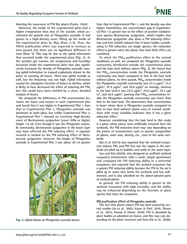 Air Quality Regulating Ecosystem Services in Wetland https//doi.org/10.22920/PNIE.2021.2.1.62 67 blocking the movement of PM like plants Fuchs, 1964 Moreover, the inside of the experimental plots had a higher temperature than that of the outside, which accelerated the growth rate of Phragmites australis. It had grown to a high-density cover, filling up the inside of the experimental plots by May D...