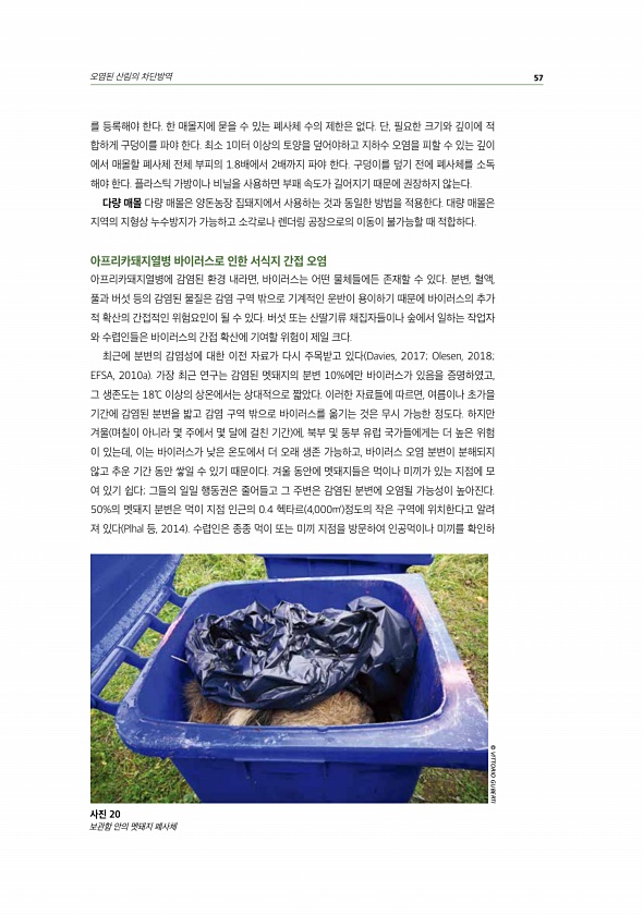 오염된 산림의 차단방역 57 를 등록해야 한다. 한 매몰지에 묻을 수 있는 폐사체 수의 제한은 없다. 단, 필요한 크기와 깊이에 적 합하게 구덩이를 파야 한다. 최소 1미터 이상의 토양을 덮어야하고 지하수 오염을 피할 수 있는 깊이 에서 매몰할 폐사체 전체 부피의 1.8배에서 2배까지 파야 한다. 구덩이를 덮기 전에 폐사체를 소독 해야 한다. 플라스틱 가방이나 비닐을 사용하면 부패 속도가 길어지기 때문에 권장하지 않는다. 다량 매몰 다량 매몰은 양돈농장 집돼지에서 사용하는 것과 동일한 방법을 적용한다. 대량 매몰은 지역의 지형상 누수방지가 가능하고 소각로나 렌더링 공장으로의 이동이 불가능할 때 적합하다. 아프리카돼지열병 바이러스로 인한 서식지 간접 오염 아프리카돼지열병에 감염된 환경 내라면, 바이러스는 어떤...