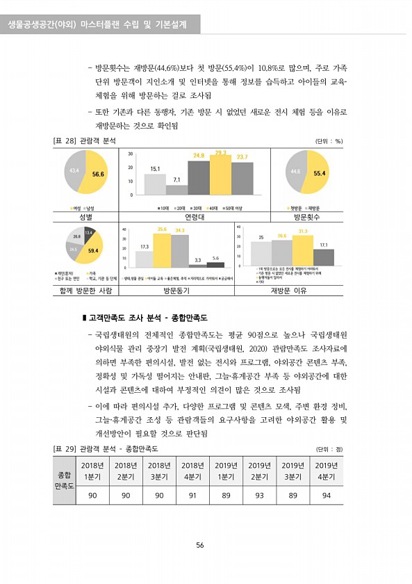 생물공생공간 야외 마스터플랜 수립 및 기본설계 56 방문횟수는 재방문 44.6% 보다 첫 방문 55.4% 이 10.8%로 많으며, 주로 가족 단위 방문객이 지인소개 및 인터넷을 통해 정보를 습득하고 아이들의 교육· 체험을 위해 방문하는 걸로 조사됨 또한 기존과 다른 동행자, 기존 방문 시 없었던 새로운 전시 체험 등을 이유로 재방문하는 것으로 확인됨 성별 연령대 방문횟수 함께 방문한 사람 방문동기 재방문 이유 [표 28] 관람객 분석 단위 % ?고객만족도 조사 분석 종합만족도 국립생태원의 전체적인 종합만족도는 평균 90점으로 높으나 국립생태원 야외식물 관리 중장기 발전 계획 국립생태원, 2020 관람만족도 조사자료에 의하면 부족한 편의시설, 발전 없는 전시와 프로그램, 야외공간 콘텐츠 부족, 정확성 및 가독...