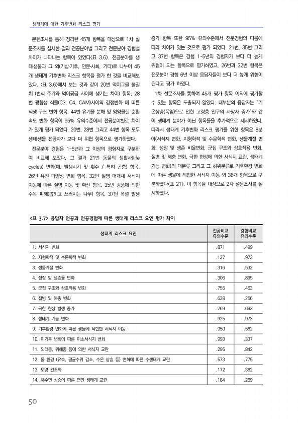 생태계에 대한 기후변화 리스크 평가 50 문헌조사를 통해 정리한 45개 항목을 대상으로 1차 설 문조사를 실시한 결과 전공분야별 그리고 전문분야 경험별 차이가 나타나는 항목이 있었다 표 3.6 전공분야를 생 태?생물과 그 외 기상?기후, 인문?사회, 기타 로 나누어 45 개 생태계 기후변화 리스크 항목을 평가 한 것을 비교해보 았다. 표 3.6 에서 보는 것과 같이 20번 먹이그물 불일 치 번식 주기와 먹이공급 사이에 생기는 차이 항목, 28 번 광합성 식물 C3, C4, CAM 사이의 경쟁변화 에 따른 식생 구조 변화 항목, 44번 유기물 분해 및 영양물질 순환 속도 변화 항목이 95% 유의수준에서 전공분야별로 차이 가 있게 평가 되었다. 20번, 28번 그리고 44번 항목 모두 생태?생물 전공자가 보다 ...