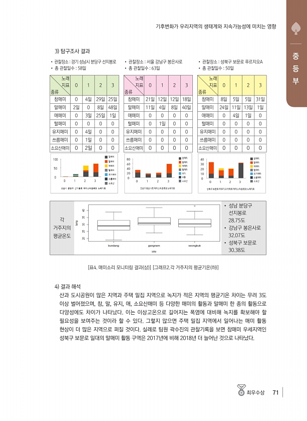 최우수상 71 중 등 부 기후변화가 우리지역의 생태계와 지속가능성에 미치는 영향 3 탐구조사 결과 ? 관찰장소 경기 성남시 분당구 선지봉로 ? 총 관찰일수 58일 ? 관찰장소 서울 강남구 봉은사로 ? 총 관찰일수 63일 ? 관찰장소 성북구 보문로 푸르지오A ? 총 관찰일수 50일 노래 지표 종류 0 1 2 3 노래 지표 종류 0 1 2 3 노래 지표 종류 0 1 2 3 참매미 0 4일 29일 25일 참매미 21일 12일 12일 18일 참매미 8일 5일 5일 31일 말매미 2일 0 8일 48일 말매미 11일 4일 8일 40일 말매미 24일 11일 13일 1일 애매미 0 3일 25일 1일 애매미 0 0 0 0 애매미 0 4일 1일 0 털매미 0 0 0 0 털매미 0 1일 0 0 털매미 0 0 0 0 유지매미 0...