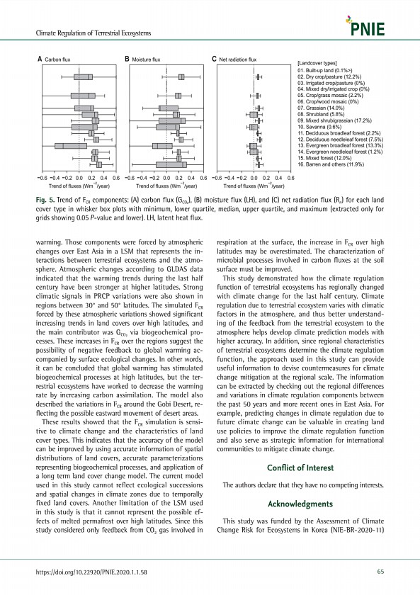Climate Regulation of Terrestrial Ecosystems https//doi.org/10.22920/PNIE.2020.1.1.58 65 warming. Those components were forced by atmospheric changes over East Asia in a LSM that represents the interactions between terrestrial ecosystems and the atmosphere. Atmospheric changes according to GLDAS data indicated that the warming trends during the last half century have been stronger at higher latitu...