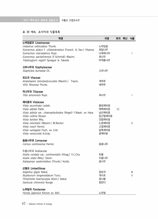 2017 백두대간 생태계 정밀조사 구룡산 고정조사구 62 ? National Institute of Ecology 학명 국명 희귀 특산 식물 노박덩굴과 Celastraceae Celastrus orbiculatus Thunb. 노박덩굴 Euonymus alatus f. ciliatodentatus Franch. & Sav. Hiyama 회잎나무 Euonymus macropterus Rupr. 나래회나무 Ⅰ Euonymus sachalinensis F.Schmidt Maxim. 회나무 Tripterygium regelii Sprague & Takeda 미역줄나무 고추나무과 Staphyleaceae Staphylea bumalda DC. 고추나무 포도과 Vitaceae Ampelopsis brevipeduncu...