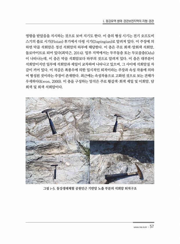 i. 동강유역 생태·경관보전지역의 지형·경관 www.nie.re.kr ? 57 영향을 받았음을 지시하는 것으로 보여 지기도 한다. 이 층의 형성 시기는 전기 오르도비 스기의 플로 시기 Floian 후기에서 다핑 시기 Dapingian 로 알려져 있다. 이 주장에 의 하면 막골 석회암은 정선 석회암의 하부에 해당한다. 이 층은 주로 회색·암회색 석회암, 돌로마이트로 되어 있다 최덕근, 2014 일부 지역에서는 두무동층 또는 두모골층 Odu 이 나타나는데, 이 층은 막골 석회암보다 하부의 것으로 알려져 있다. 이 층은 대부분이 석회암이지만 일부에 석회암과 셰일이 교차하여 나타나고 있으며, 그 사이에 석회암질 자 갈이 끼어 있다. 이 자갈은 폭풍우에 의한 일시적인 퇴적이라는 주장과 속성 작용에 의하 여 형성된 것...