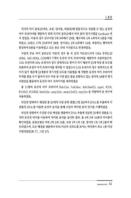 I. 총 괄 www.nie.re.kr ? 61 각각의 먹이 분류군 어류, 조류, 양서류, 파충류 에 범용적으로 적용할 수 있는 유전자 마커 프라이머를 개발하기 위해 각각의 분류군에서 여러 종의 염기서열을 Genbank 에 서 얻었음. 어류의 경우 담수어류 5목 9과에서 29종, 해수어류 4목 4과에서 4종을 이용 하였고, 조류는 17목 25과에서 28종, 양서류는 2목 6과에서 16종, 파충류는 뱀아목에 한정하여 8종을 이용하였고 모든 종은 국내 서식종으로 한정하였음. 수달의 주요 먹이 분류군인 어류의 경우 총 세 곳의 미토콘드리아 DNA 부위 12S rRNA, 16S rRNA, COI 에서 7개의 유전자 마커 프라이머를 개발하여 사용하였으며, 12Sr 유전자와 16Sr 유전자의 경우 상대적으로 변이가 적기...