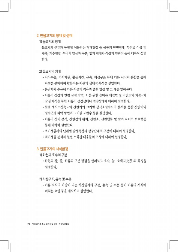 70 멸종위기종 증식·복원 교육 교재 A 역량강화용 2. 민물고기의 형태 및 생태 1 물고기의 형태 물고기의 분류와 동정에 이용되는 형태형질 중 몸통의 단면형태, 부위별 이름 및 계측, 계수형질, 무늬의 양상과 구분, 입의 형태와 식성의 연관성 등에 대하여 설명 한다. 2 물고기의 생태 ?? 서식수층, 먹이자원, 활동시간, 유속, 하상구조 등에 따른 서식지 분할을 통해 자원을 분배하여 활동하는 어류의 생태적 특성을 설명한다. ?? 온난화와 수온에 따른 어류의 적응과 출현 양상 및 그 예를 알아본다. ?? 어류의 성장과 연령 산정 방법, 이를 위한 올바른 채집법 및 비만도와 체중-체 장 관계식을 통한 어류의 생장상태나 영양상태에 대하여 설명한다. ?? 월별 생식소성숙도와 산란기의 크기별 생식소성숙도의 분석을 ...