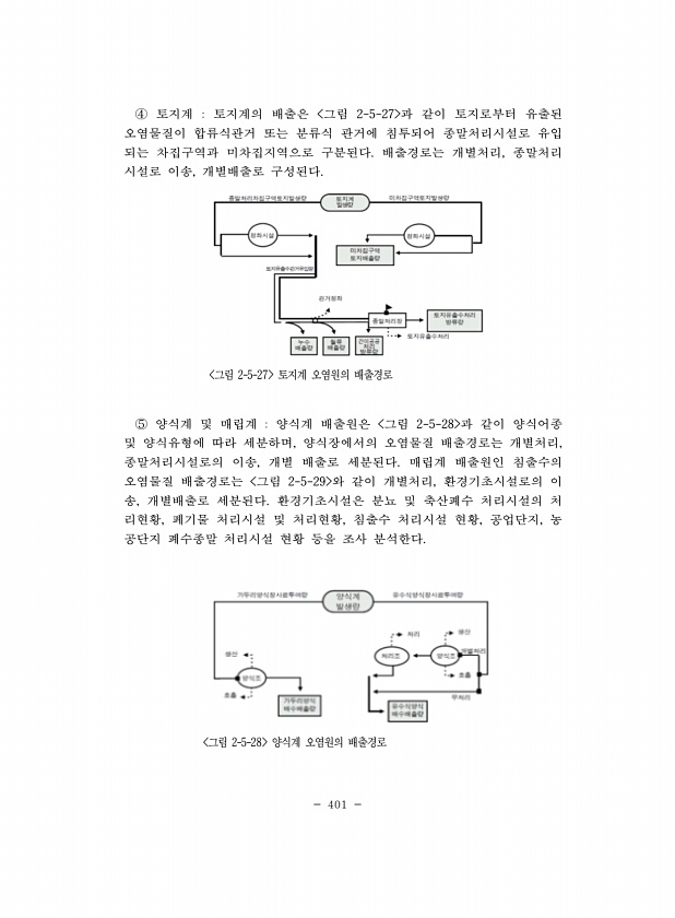 401 ④ 토지계 토지계의 배출은 그림 2-5-27 과 같이 토지로부터 유출된 오염물질이 합류식관거 또는 분류식 관거에 침투되어 종말처리시설로 유입 되는 차집구역과 미차집지역으로 구분된다. 배출경로는 개별처리, 종말처리 시설로 이송, 개별배출로 구성된다. 그림 2-5-27 토지계 오염원의 배출경로 ⑤ 양식계 및 매립계 양식계 배출원은 그림 2-5-28 과 같이 양식어종 및 양식유형에 따라 세분하며, 양식장에서의 오염물질 배출경로는 개별처리, 종말처리시설로의 이송, 개별 배출로 세분된다. 매립계 배출원인 침출수의 오염물질 배출경로는 그림 2-5-29 와 같이 개별처리, 환경기초시설로의 이 송, 개별배출로 세분된다. 환경기초시설은 분뇨 및 축산폐수 처리시설의 처 리현황, 폐기물 처리시설 및 처리현황, 침출수 처...