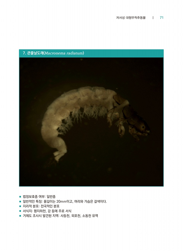 저서성 대형무척추동물 ┃ 71 7. 큰줄날도래 Macronema radiatum ■ 법정보호종 여부일반종 ■ 일반적인 특징몸길이는 20mm이고, 머리와 가슴은 갈색이다. ■ 지리적 분포전국적인 분포 ■ 서식지평지하천, 강 등에 주로 서식 ■ 거제도 조사시 발견된 지역사등천, 외포천, 소동천유역