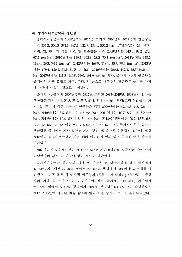 51 라. 종가시나무군락의 생산성 종가시나무군락의 2009년부터 2013년 그리고 2016년과 2017년의 현존량은 각각 336.2, 350.3, 371.1, 397.1, 422.7, 484.1, 505.2 ton ha-1였다 그림 23 줄기, 가지, 잎, 뿌리의 식물 기관 별 현존량은 각각 2009년에는 143.3, 98.2, 27.4, 67.2 ton ha-1, 2010년에는 149.5, 102.6, 28.2, 70.1 ton ha-1, 2011년에는 158.2, 109.4, 29.3, 74.2 ton ha-1, 2012년에는 168.9, 118.1, 30.7, 79.4 ton ha-1, 2013년 에는 179.4, 126.9, 31.9, 84.5 ton ha-1, 2016년에는 206.2, 142.4,...