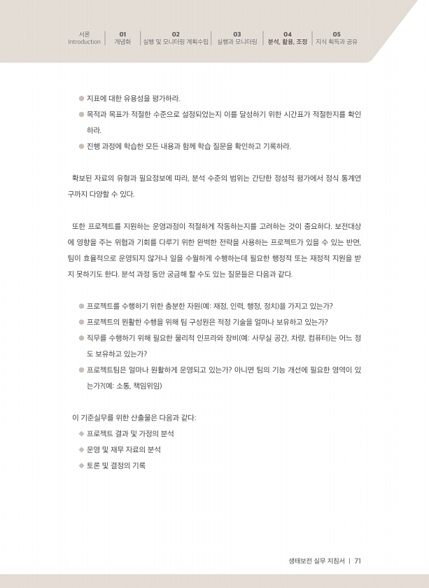 생태보전 실무 지침서 | 71 서론 Introduction 01 개념화 02 실행 및 모니터링 계획수립 03 실행과 모니터링 04 분석, 활용, 조정 05 지식 획득과 공유 ● 지표에 대한 유용성을 평가하라. ● 목적과 목표가 적절한 수준으로 설정되었는지 이를 달성하기 위한 시간표가 적절한지를 확인 하라. ● 진행 과정에 학습한 모든 내용과 함께 학습 질문을 확인하고 기록하라. 확보된 자료의 유형과 필요정보에 따라, 분석 수준의 범위는 간단한 정성적 평가에서 정식 통계연 구까지 다양할 수 있다. 또한 프로젝트를 지원하는 운영과정이 적절하게 작동하는지를 고려하는 것이 중요하다. 보전대상 에 영향을 주는 위협과 기회를 다루기 위한 완벽한 전략을 사용하는 프로젝트가 있을 수 있는 반면, 팀이 효율적으로 운영되지 ...